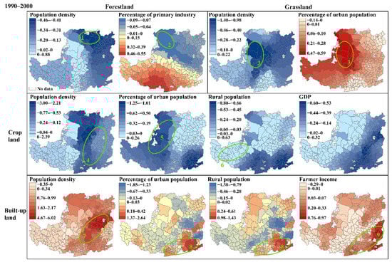 During 1990–2000, the percentage of forestland area (against county area) in 69% of counties (196 out of 284 counties) increased, with a spatial concentration in the southern parts, and 49% of counties experienced grassland loss across the northwest (Figure 7a). The percentage of built-up land increased in 95% of counties, especially in the east, and 36% of counties experienced cropland gain, with hotspots in the northwest.