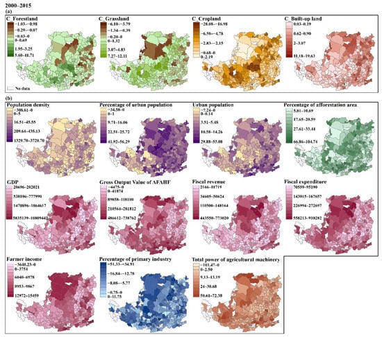 Compared with the earlier period (1990–2000), the increasing trend of population in this period is weaker with 82% (235 out of 288) of counties experiencing increased population density (Figure 9b). The magnitude and percentage of urban population in most counties (92% and 87%, respectively) increased, with hotspots in the northern and southeastern regions. A range of economic indicators, including the GDP, gross output of AFAHF, fiscal revenue, fiscal expenditure and farmer income, were found to increase in all the counties (above 99%), especially in the northern region and southern extremities. The percentage of primary industry decreased across a large area of the region, including 93% of counties mostly located in the north and west. Some 92% of counties experienced overall increases in the total power of agricultural machinery. Peak values for the cumulative percentage of afforestation area were found in the central and western regions, which is the key zone of multiple ecological restoration programs.