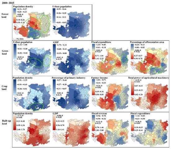The four dominant factors for cropland included population density, percentage of primary industry, farmer income and total power of agricultural machinery. Population density displayed a negative association with cropland loss, especially in the southeast (circle 6). In the central and western regions, decreases in primary industry percent showed a strong negative association with cropland loss. The influence of increased farmer income on decreasing cropland shifted from positive in the west to negative in the east. Increases in the total power of agricultural machinery showed a consistently positive association with the cropland loss, with hotspots in the central region. Population density, GDP, fiscal revenue and fiscal expenditure dominantly influenced built-up land expansion from 2000 to 2015. Population density and GDP both showed strong positive associations with the built-up land gain across a large area of the region, with hotspots in the central and eastern regions, respectively. The impacts of increased fiscal revenue and expenditure showed complex and contrary spatial patterns.