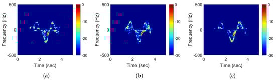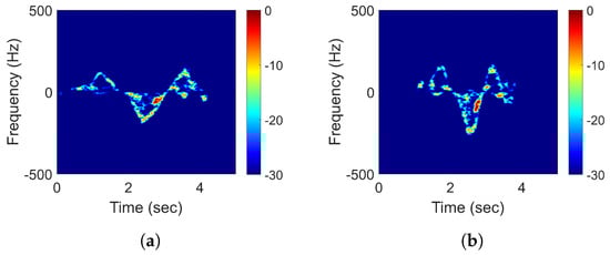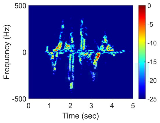 where is the time index, is the discrete frequency index, and L is the length of the window function . An example of the spectrogram, scaled to 0 , is illustrated in Figure 1. The sliding window is rectangular with length 2048 (0.16 s), and K is set to 4096. We consider the MD signal as a deterministic signal rather than a stochastic process, and do not assume an underlying frequency modulated signal model that calls for optimum parameter estimation [41,42,43].