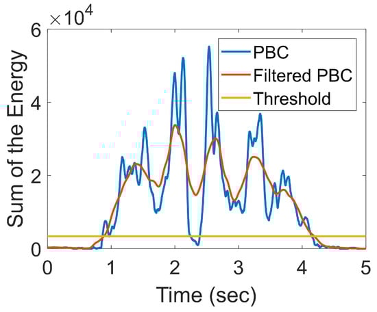 where depends on the noise floor and is empirically chosen from the range . and , respectively, represent the minimum and maximum values of . In this paper, is set to 0.1, which means 10% over the minima. The threshold is indicated by a a yellow line shown in Figure 2. The onset time of each motion is determined as the time index at which the filtered PBC exceeds the threshold, whereas the offset time corresponds to the time index at which the filtered PBC falls below the threshold.