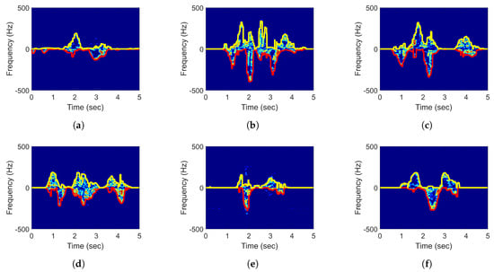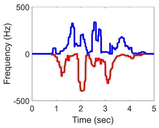 where and represent the scale factors; both are less than 1. These scalars can be chosen empirically, but an effective way for their selection is to maintain the ratio of the energy to the threshold values constant over all time samples. This constant ratio can be found by time locating the maximum positive Doppler frequency and computing the corresponding energy at this location. In this example, , Hz and , where and represent the location of the maximum positive Doppler frequency and its strength, respectively. The corresponding scale factor can be found by . Once the threshold is computed, the positive frequency envelope is then provided by locating the Doppler frequency at each time instant for which the spectrogram assumes the first higher or equal value to the threshold. This frequency, in essence, represents the effective maximum instantaneous Doppler frequency. A similar procedure can be followed for the negative frequency envelope. The positive frequency envelope, , and negative frequency envelope, , are concatenated to form the feature vector . The extracted frequency envelopes of the example considered are plotted in Figure 4.