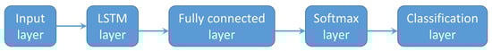 The diagram in Figure 6 illustrates the architecture of the employed LSTM network. The input layer inputs the time-series data into the network, and the LSTM layer learns temporal information from the input. The fully connected layer combines all the features learned by LSTM layers for classification. Therefore, the output size is equal to the number of classes. The softmax layer normalizes the output of the former layer to be used as the classification probabilities.