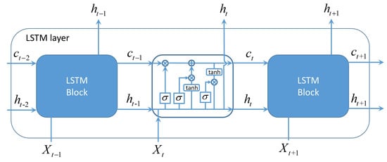 where is the forget gate, is the input gate, is the cell candidate, is the output gate. The W, R, and b are the input weights, recurrent weights and bias, respectively, with the subscripts corresponding to different gates. The , , and are the parameters of the forget gate, the , , and are the parameters of the input gate, the , , and are the parameters of the cell candidate, and the , , and are the parameters of the output gate. The and represent the sigmoid activation function and hyperbolic tangent activation function, respectively. The ⊙ denotes the Hadamard product.