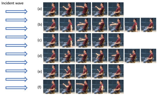 Illustrations of six different arm motions. (a) Pushing arms and pulling back; (b) crossing arms and opening; (c) crossing arms; (d) rolling arms; (e) stop sign; (f) pushing arms and opening.