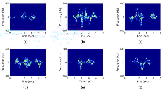 Spectrograms of six different arm motions. (a) Pushing arms and pulling back; (b) crossing arms and opening; (c) crossing arms; (d) rolling arms; (e) stop sign; (f) pushing arms and opening.