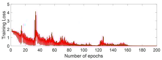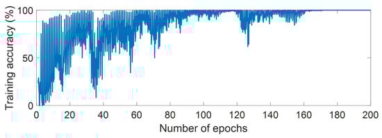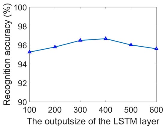 The structure of the LSTM method, described in Section 4.2, is applied. The input data were the maximum instantaneous Doppler frequencies. The output of the LSTM layer was the last sequence, and its size was determined by trial and error. During the training process, the batch number was set to 10, and the maximum epochs was 200. An epoch is an iteration over the entire training samples. The optimization solver was the stochastic gradient descent with momentum optimizer, and the learning rate was the constant value 0.001. The training accuracy and the loss of the training during the training process is plotted in Figure 14 and Figure 15. The arm motion recognition results with different output sizes are shown in Figure 16. The highest accuracy of 96.67% was achieved with the output size 400. The confusion matrix is given in Table 1.