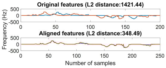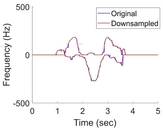 In our previous work [16,17], each of the original extracted envelope features contained 2000 samples for both positive and negative Doppler frequencies, and were directly input into the NN classifier with the L1 distance measure, achieving an overall accuracy 97.17% [16]. Considering the real-time processing and to avoid high computational burden of DTW dealing with long time series, we downsampled the envelopes to 200 samples. Figure 19 shows one example of the frequency envelope before and after downsampling. It is evident that the main characteristics of the envelope are maintained when downsampled. To further examine the impact of downsampling on the NN classifier, the downsampled features were put into the NN classifier with the L1 distance. This resulted in a classification accuracy of 97.13% [16], which is nearly the same as when using the entire sequence. The corresponding confusion matrix is given in Table 2.