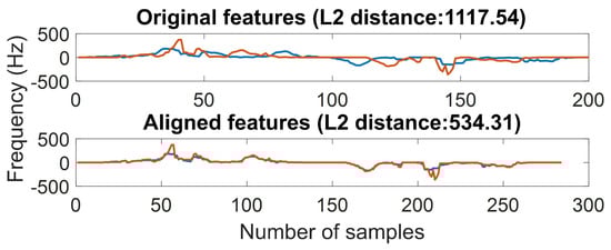 The DTW distance is robust to time misalignments and time scaling. Figure 17 shows two envelopes of the same motion class, but with a large misalignment in time. Although similar in shape, the L2 distance, which only accounts for the corresponding samples in the two time series, yields a high error norm. By applying the DTW distance, the two time series can be aligned well and the effect of the misalignments is significantly reduced. Similarly, two time series with different time scalings can also be aligned in value. Figure 18 shows the alignment of the envelopes of two members of the same motion class but with different speeds. In essence, by applying the DTW method, the two time series which belong to the same motion class assume small distance and high similarity, which reduces the probability of misclassification.