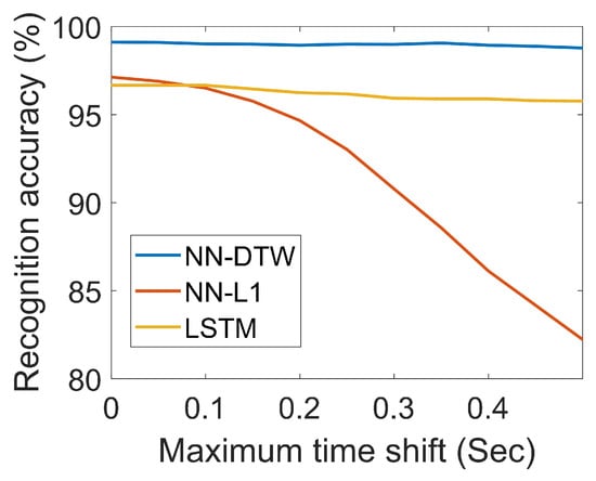 The NN classifier with the L1 distance only considers the frequency envelope values individually, whereas the DTW distance takes into account the temporal information. Thus, it is expected that the NN classier with the DTW distance can achieve a better performance. The onset and offset times of each motion are obtained by the PBC, and used to center the individual motion in the middle of the spectrograms. Since the time span and speed of each motion may vary, misalignments can occur within the same class. To validate the DTW method robustness to time misalignment, each test envelope feature was shifted to the left or right within , where is the maximum time shift. This time shift process is not included in the training data, which means the classifier had no knowledge about the time shift during the training. The recognition accuracy based on the NN-L1 and NN-DTW classifiers with different maximum time shifts is plotted in Figure 20. With the maximum time shift of 0.5 s, the accuracy based on the NN-L1 classifier dropped by 15.06 %, whereas the NN-DTW-based method only dropped by 0.33%. We also consider the affect of the time misalignment on the LSTM method. From Figure 20, it is clear that the recognition accuracy is maintained and is unchanged with different time shifts. This demonstrated that both the NN-DTW method and the LSTM method are robust to time misalignment.