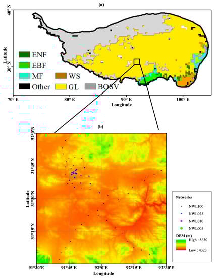 Study area: (a) MODIS land cover types aggregated to 0.25° over the Tibetan Plateau, where EF: Evergreen Needleleaf Forest; EBF: Evergreen Broadleaf Forest; MF: Mixed Forest; WS: Woody Savannas; GL: Grasslands; BOSV: Barren or Sparsely Vegetated. and (b) Naqu soil moisture monitoring network and the distribution of measuring stations based on the Digital Elevation Model map, where NWL100, NWL025, NWL010 and NWL005 are four filed networks with size of 1° × 1°, 0.25° × 0.25°, 0.10° × 0.01°, 0.05° × 0.05°.