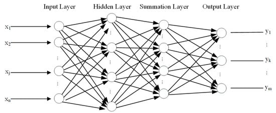 GRNN was proposed by Specht in 1991 [30]. The GRNN has four layers, including input layer, hidden layer, summation layer and output layer (as shown in Figure 3). As a kind of radial basis function neural network and a typical machine learning model, GRNN is often used for function approximation to solve regression problems. GRNN has the ability to transform data from a low to a high dimensional space. Hence, it has a strong, non-linear mapping ability with a high degree of fault tolerance and robustness. Studies have shown that the GRNN has greater advantages over BNPP in the ability to approach and learning speed, and can work well with small sample sizes [31].
