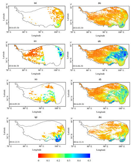 The original FY-3B SM (labeled as FY_Ori SM) of 2014 was reconstructed and downscaled to generate high spatio-temporal resolution SM. Maps of FY_Ori SM and the corresponding spatio-temporal resolution-improved SM (labeled as FY_Imp SM) for 30/03, 30/06, 30/09, 31/12 over the TP are shown in Figure 4. The FY_Imp SM improved in terms of spatial details and preserved spatial patterns similar to those of FY_Ori SM over most of the TP. Higher SM was mainly found in the east, especially during the summer. Lower SM was mainly found in the west, especially in the winter. The southeastern TP had high SM all year. From the four figures, we can see that the temporal distribution characteristics of the FY_Imp SM were consistent with FY_Ori SM, increasing from winter to summer. Additionally, the dynamic range of FY_Ori SM was also reproduced in the FY_Imp SM, indicating that the GRNN model has a robust performance. The extremely wet area in the southeastern TP was also captured by the FY_Imp SM. This represents an important improvement with respect to other downscaling algorithms based on soil moisture indices, which fail to capture the characteristic in this region [32].