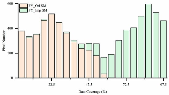 The data coverage was calculated after resampling the FY_Imp SM from 0.05° to 0.25°. Figure 5 shows the histograms of the FY_Ori SM and FY_Imp SM data coverages. The coverage of FY_Ori SM is lower than 30% over most of the TP. The entire TP SM coverage was improved from 23.7% to 78.7% with our proposed method. Regardless of the surface covered by water/glaciers or the soil being frozen, FY_Imp SM is temporally continuous at the daily scale.