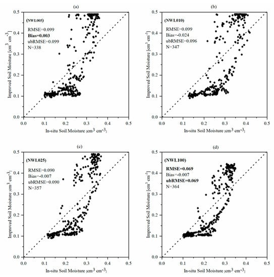 In the two large (NWL025 and NWL100) in situ networks, we calculated the error metrics of FY_Ori SM and FY_Imp SM against the in situ observations. From Table 2, we can see that FY_Imp SM is comparable to FY_Ori SM. However, the FY_Imp SM has more observation samples than FY_Ori SM, meaning that the temporal resolution is significantly improved; this is consistent with Section 3.1 and Section 3.2. Compared with the FY_Ori SM, the RMSE and ubRMSE of FY_Imp SM were slightly decreased, thought the absolute bias showed little change. This means that the spatio-temporal resolution-improving process could reduce the statistical error by increasing the number of valid observations. This gives us an indication that satellite-based SM products perform differently when data have different time spans, and a validation based on long-term observations seems more credible. This assumption should be verified in future research.