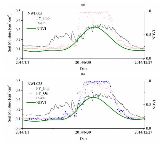 Time series of FY_Imp soil moisture (SM) and FY_Ori SM compared with in situ measurements for 2014. (a) FY_Imp SM at NWL005; (b) FY_Ori and FY_Imp SM at NWL025.