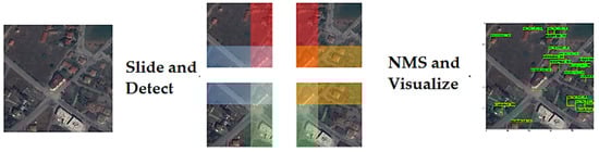 43]. As an example schema, when the sliding was performed with a 300-pixel size over a 500 × 500 pixel image patch, the objects at the edges of the window could not be detected or the bounding box offsets of them would be incorrect. To tackle this problem, an overlapping area between two windows was determined as 100 pixels, which covers the object size for this research. In the sliding process for an image with a certain overlap, k × l windows were obtained to detect by the object detector for the horizontal and vertical directions, respectively: