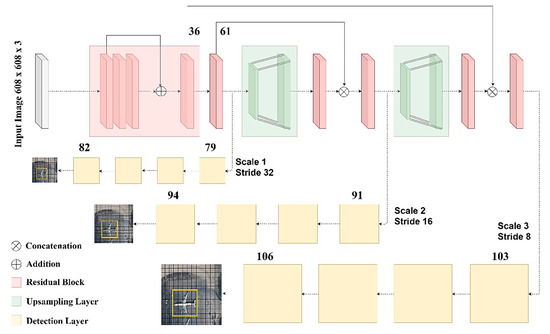 45]. This makes the architecture more efficient at the detection of smaller objects but results in slower processing than the previous versions due to the complexity of the framework (