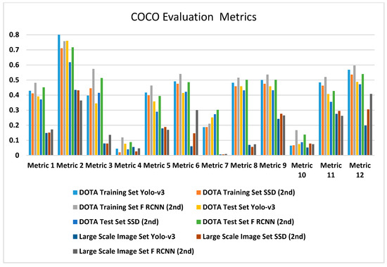 Through the transfer learning approach, the training was started with the implementation of the pre-trained parameters to include the useful information gathered from a previously trained network with different data used for another problem in the computer vision area. Although the COCO dataset contains natural images, the pre-trained model of the networks, which was utilized from COCO, can be used for the current research as well, because features, such as the edge, corner, shape, and color, can be implemented, which form the basis of all of the vision tasks. After starting the network with the parameters of the pre-trained model, it was fed with training examples from the produced DOTA image chips.