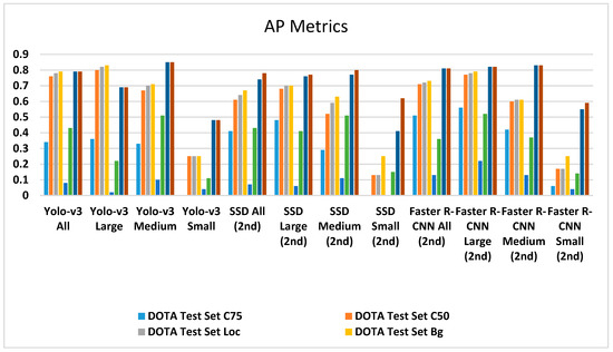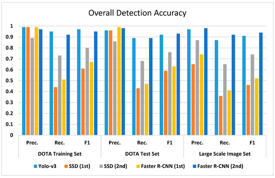 © platform, and Jilin 1 (JL-1) and Gaofen 2 (GF-2) satellites. It contains 15 object categories as airplane, ship, storage tank, baseball diamond, tennis court, basketball court, ground track field, harbor, bridge, large vehicle, small vehicle, helicopter, roundabout, soccer ball field, and swimming pool. The image sizes are in the range of 800 × 800 to 4000 × 4000. In this study, airplane detection was aimed for; therefore, 1631 images that contained 5209 commercial airplane objects were selected from the dataset. The images were split to the size of 1024 × 1024 patches to train Faster R-CNN and 608 × 608 for training SSD and YOLO-v3 detectors. The spatial resolution of the images varies in range 0.11 to 2 m and they contain various orientations, aspect ratios, and pixel sizes of the objects. In addition, the images vary according to the altitude, nadir-angles of the satellites, and the illumination conditions. The selected images were separated as 90% for training and the rest for testing. The DOTA training and test sets also include different samples in terms of airplane dimensions, background complexity, and illuminance conditions. Some image patches have some cropped objects, and some examples are black and white panchromatic images. These variations in the DOTA dataset enable the trained object detection architectures to achieve a similar performance in different image conditions (
