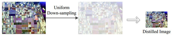 In this paper, the sampling method is introduced into the input domain of a classification model to alleviate the labor-intensive labeling and heavy computational burden for highly redundant pixels. Specifically, a smaller image of the entire PolSAR image is obtained by the uniform down-sampling method as shown in Figure 1. To reduce the computational burden, the smaller image is used for classification to obtain a label matrix . Thus, the overall pixels are much fewer in number than in the traditional classification method that extracts features and learns parameters from the entire image. Then, the classification result of this down-sampled image is transferred to the label matrix for the entire image. On the one hand, the down-sampled image needs fewer labeled pixels and less computation time to train the model. On the other hand, the region structure information will be retained in the sampled image of the entire image. Thus, it is desirable to design the loss so as to transfer all label information without missing any important ones from the known labels.
