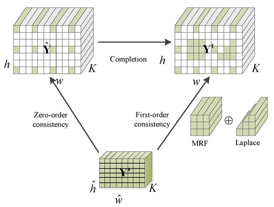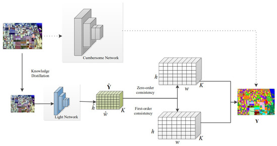 where denotes filling an observed label matrix with in the corresponding down-sampling location, and are the weighting coefficients that indicate the importance of these two terms in first-order priority. First, is obtained with a light classification network. Then, the label matrix completion task enters into solving Equation (8), which is a differentiable squared function with a closed-form solution for . The solution for this pixel i is [21,48]: