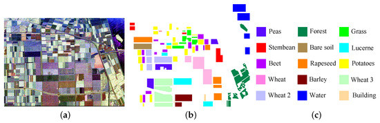 Information for the PolSAR database tested and detailed here is shown in Figure 4. Figure 4a is the Pauli RGB image of Flevoland from NASA/JPL AIRSAR in 1989, which is an L-band four-look PolSAR database of size 750 × 1024 and a resolution of 12 × 6 m. Figure 4b,c show the ground-truth image and all terrains in this dataset, respectively, which includes 15 different classes. Here, the under-sampled image is used for semi-supervised classification with a light network and completing the label matrix for the entire image.