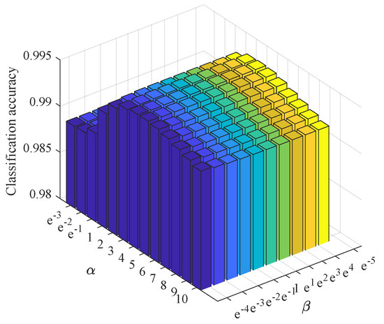 Parameters play an important role in the classification performance, which is usually chosen within a range. The parameters to be tested are the coefficients and before the MRF term and Laplace term, the aims of which are to retain smoothness in one region and the edge between two regions, respectively. In our experience, we vary the parameter from to 10 for and to with the interval of for . Classification accuracy versus different parameter setting values is shown in Figure 5. On the one hand, the classification-accuracy values are almost unchanged as the change of parameter , which reveals that the Laplace term is robust in the proposed method. On the other hand, classification accuracy increases as parameter varies from to 1, while decreasing from 1 to 10 and thus reaching the highest value when is 1. As a whole, it can be seen that the classification-accuracy values exhibit little difference for various . Thus, in the following experiments, the chosen parameter values are 1 and for and , respectively.
