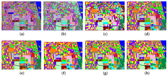 To validate the robustness of the label matrix completion method, the down-sampled PolSAR images with different down-sampling rates were tested on dataset Flevoland, as shown in Figure 4. In Table 1, the number of pixels in the down-sampled images are given to illustrate the computational cost compared with the entire image. First, the classification results are shown in Figure 6a–d with down-sampling rates of , , , and , respectively. Then, a priority matrix for the entire image is obtained by adding the labels into the corresponding locations in the large PolSAR image, as shown in Figure 6e–h. Finally, the final label matrix completion results are shown in Figure 6i–l.