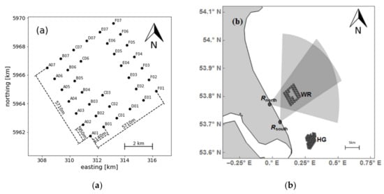 (a) Wind farm layout of Westermost Rough with six rows of turbines (A-F) and up to seven turbines in each row (01 to 07). (b) Overview of radar positions and and the areas covered by their scans. Two wind farms are present: Westermost Rough (WR) and Humber Gateway (HG).