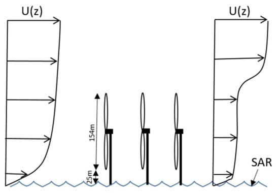 Figure 2 shows a sketch of the wind profile upstream of a wind farm (distance between turbines not to scale) and downstream in the turbine wake. The wind speed in the wake is reduced due to energy extraction of the wind turbines. SAR measurements are taken at the surface of the ocean, whereas the wind farm wake is generated in the rotor swept area from 25 m to 179 above the ocean surface.