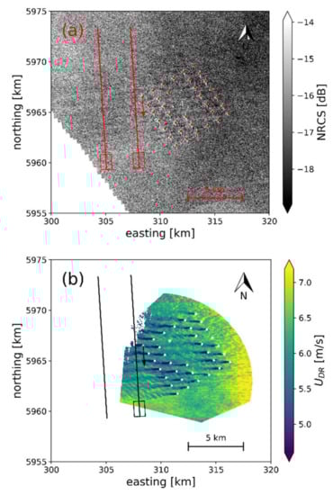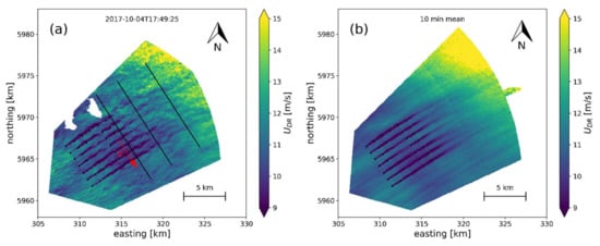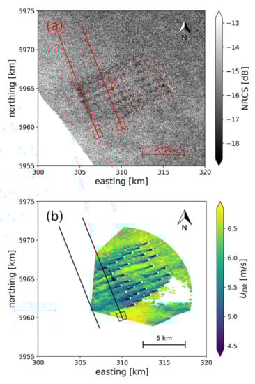 Many validation studies have addressed the accuracy of SAR wind fields compared to wind measurements from ocean buoys [,,], scatterometers [], meteorological masts [], and wind lidars []. These studies suggest that wind speeds over the open ocean can typically be retrieved with a root mean square error on the order of 1.3–1.5 m s−1. Wind farm wakes have been mapped from SAR observations by the C-band sensors ERS [], Envisat, Radarsat-2 [], and Sentinel-1 []. Wakes have also been investigated using wind turbine production data [], meso-scale modeling [], ground based lidar [], and airplane campaigns []. The previous works all indicate that wakes can extend between few and tens of kilometers downstream of wind farms depending on stability conditions i.e., the temperature-driven stratification of the atmosphere.