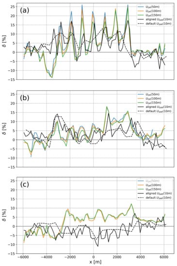 Transects for Case 1 at (a) 700 m, (b) 3700, and (c) 7700 m distance downstream. Three Doppler radar heights, 50, 100 and 150 m are shown, and SAR wind speeds retrieved at the transect with aligned and default processing. x is the cross-wind distance from turbine F04 (middle of the last row).