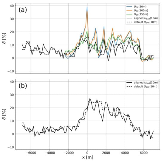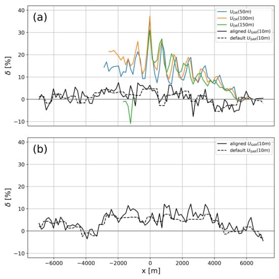 For Case 2 in Figure 10a, the Doppler radar measurements clearly show individual wakes and an overall reduction of the wind speed with a maximum velocity deficit around 35%. The velocity deficit is highest at 0 m cross-wind distance which is closest to the wind farm. Velocity deficits from SAR range between −6% and 8% but do not follow the individual wakes as seen from the Doppler radars. There is a tendency towards positive velocity deficits from −3000 m to 2000 m where the wind farm wake would be expected and little difference between wind speeds retrieved with default or aligned processing. The second transect 3700 m downstream of the wind farm in Figure 10b shows a more clearly pronounced wake with positive velocity deficits between 2% and 12% between −3000 m and 4000 m cross-wind where the wake is expected. No Dual-Doppler measurements are available here due to the experimental setup.