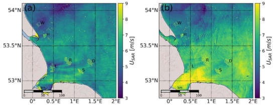 SAR wind retrieved at 500 m resolution for (a) Case 2, and (b) Case 3. Wind farms visible are: Westermost Rough (W), Humber Gateway (H), Lincs (L), Race Bank (R), Sherinham Shoal (S), Dudgeon (D).