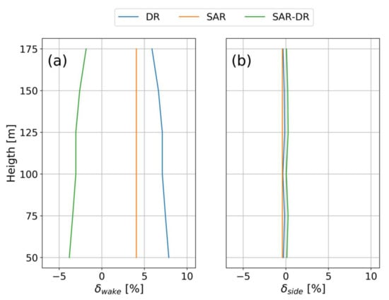 Comparison of velocity deficits (δ) from SAR, Dual-Doppler radar (DR), and their difference for (a) upstream and wake and (b) upstream and side.