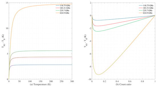 where represents the channel, , , are the counts of Earth, hot and cold targets, respectively. , are the radiance of the hot target and the cold space obtained by the instrument, respectively. means the system nonlinearity difference, is the nonlinearity coefficient. The possible error sources from calibration are the residual nonlinearity radiance of calibration and the hot target offset, due to the instability of the calibration target. In this study, the hot target temperature is added by a −0.5 K offset to produce the uncertainty in calibration. The residual nonlinearity brightness temperature is set to a standard deviation of 0.3 K, which is a typical value measured by the radiometer test. Another possible source of error is the Rayleigh–Jeans (R–J) approximation used in radiometric calibration []. R–J approximation can convert radiance to brightness temperature by using a linear equation, and is widely used in radiometric calibration at the MMW band up to the THz band. However, R–J approximation will lead to a brightness temperature error which varies with frequency and temperature, and it is not easily corrected by adding an offset. In this simulation, in Equation (3) is replaced by when using the R–J approximation, and and are set to 2.73 K and 300 K, respectively. The variations of calibration errors with temperature and count ratio are shown in Figure 2. The count ratio means . Figure 2 shows that although the differences seem to be a constant error above 50 K, it also varies with count ratio. So, it cannot be corrected easily.