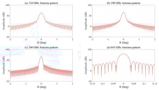 The antenna pattern of TALIS: (a) the 118 GHz antenna pattern; (b) the 190 GHz antenna pattern; (c) the 240 GHz antenna pattern; (d) the 643 GHz antenna pattern.