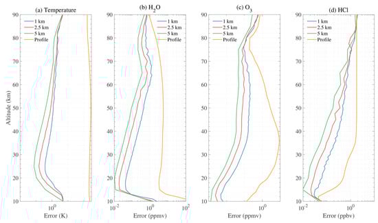 The retrieval precision of the four radiometers with different retrieval grids, and only random noises are added: (a) 118 GHz temperature retrieval; (b) 190 GHz H2O retrieval; (c) 240 GHz O3 retrieval; (d) 643 GHz HCl retrieval. The 1 km, 2.5 km, 5 km represent the different retrieval grids. The “Profile” represents the typical profile.