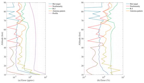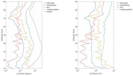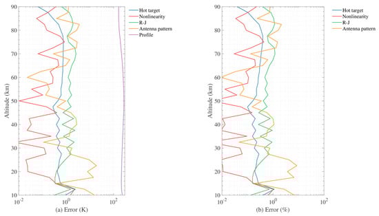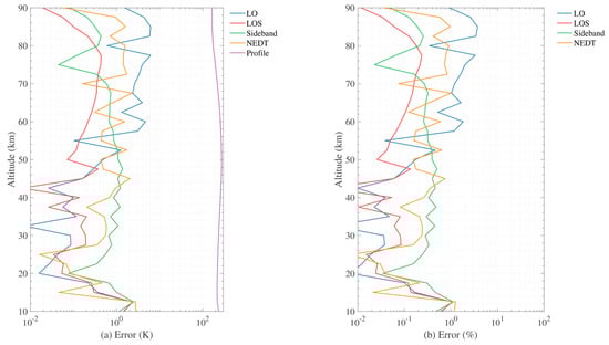 The temperature retrieval errors induced by different instrument uncertainty sources: (a) absolute and (b) relative retrieval errors. The uncertainties assumed are summarized in Table 3.