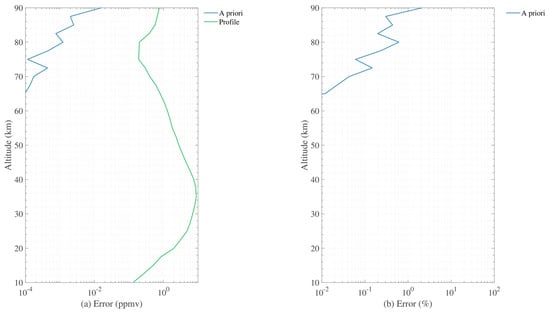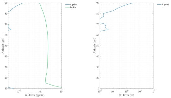 To estimate the effect of the a priori profile, the species profiles are multiplied by 120%, which is to serve as the a priori profiles, and the temperature profile is added as a 5 K offset. They are the standard deviation commonly used in building the a priori covariance matrix []. Pressure can be retrieved together with temperature, and a 5% error is added to the pressure profile to be the a priori pressure profile.