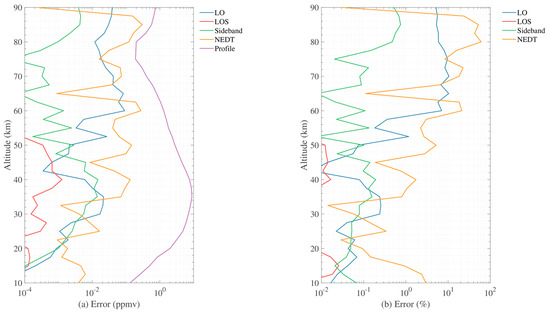 The O3 retrieval errors induced by various instrument uncertainties are shown in Figure 13. NEDT is the major error source in the middle and upper atmosphere which leads to an error of 10%–50% above 60 km. The local oscillator offset (LO) plays a secondary important role in instrument uncertainties above 60 km with an error of around 10%. The impact below can be neglected, since the line width is quite large compared with 0.5 MHz. The effect of sideband weight and pointing offset (LOS) has almost no influence in the observation region.