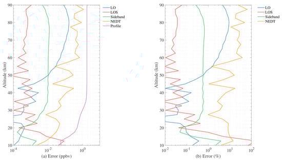 The O3 retrieval errors induced by different instrument uncertainty sources: (a) absolute and (b) relative retrieval errors. The uncertainties assumed are summarized in Table 3.