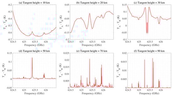 The brightness temperature difference − at various tangent height measured by 643 GHz radiometer (625 GHz spectrometer): (a) 10 km; (b) 20 km; (c) 30 km; (d) 50 km; (e) 70 km; (f) 90 km.