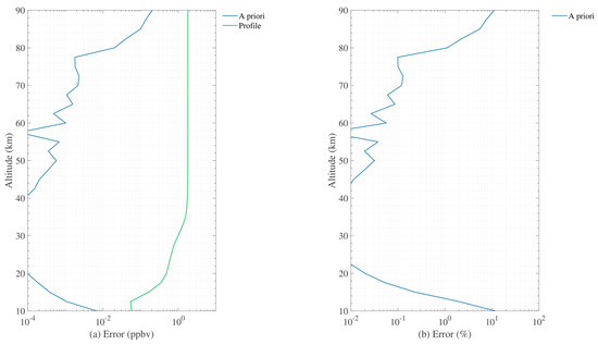 The trace gas species can be retrieved by using the optimal estimation (OEM) retrieval method, which requires good knowledge of the atmospheric profiles as well as the measurement noise []. Since the method involves the nonlinear weighted least squares optimization and includes the use of a priori constraints for regularization, the a priori data mainly affects the region where measurement information is lacking, and the noise dominates the region where the measurement signal is large [].