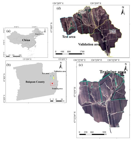 Location of the study area. (a) China. (b) Baiquan County. The areas of training, testing, and independent validation are shown in red, blue, and yellow rectangles. (c) Training area. (d) Test area and validation areas.