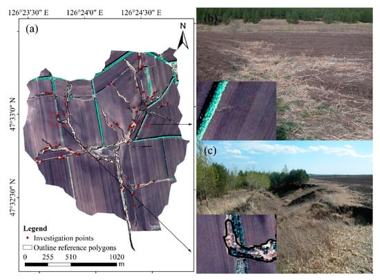 Reference data from the field survey for training. (a) Investigation points and manually delineated reference polygons of gully erosion for training. (b) An ephemeral gully that was not considered in this study. (c) An example of a gully that was extracted in this study.