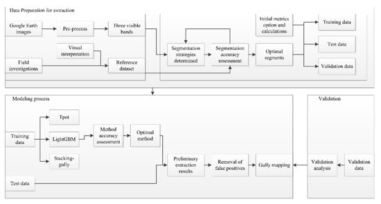 The presented method for the extraction of gully erosion was implemented by employing OBIA and the optimal method based on machine learning algorithms on GE images. Figure 3 shows a survey of the workflow, which can be summed up as follows: (1) Creating the sample dataset within the eCognition and ArcGIS software, (2) determining the optimal machine learning method for preliminary extraction of gullies, (3) revising the extraction results using eCognition, and (4) validating the method presented. These steps are explained in further detail below.