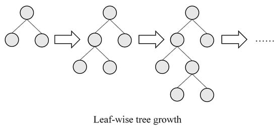 For the above-mentioned reasons, LightGBM alone was analyzed. Using tree-based learning methods, LightGBM offers a gradient boosting framework that includes two novel techniques: Gradient-based One-Side Sampling (GOSS) and Exclusive Feature Bundling (EFB) [28]. Due to the elimination of a high percentage of data instances with few gradients using GOSS, GOSS only employs the remainder to assess the information gain. With EFB, mutually exclusive features are packed so that the number of features decreases. The implementation of GOSS and EFB increased the speed of the method by dozens of times. To achieve accuracy optimization, LightGBM grows trees by a leaf-wise (best-first) approach that grows leaves with a max delta loss (Figure 5) [58]. In addition, considering the possible leaf-wise over-fitting phenomenon with a small dataset, LightGBM restricts tree depth using a parameter. However, the trees still grow leaf-wise even when this parameter is identified.