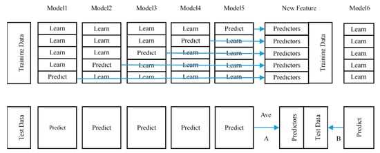 Considering multiple machine learning methods, including LightGBM, stacking was applied. The idea of this approach is derived from stackedgeneralization, proposed by Wolpert [59]. Stacking is a hierarchical fusion model (Figure 6). For example, when we fuse three machine learning models trained with different characteristics, we use them as the basic models. Then, we train a sub-learner on the basic models; the sub-learner is used to organize the basic learner’s predictions or the predictions of the basic models as input, so the sub-learner learning organization assigns weight to the predictions of the basic models to obtain the final prediction. The following points should be noted in the selection of each model: First, basic models should be strong models, while the sub-learner of the second layer may use a simple classifier to prevent over-fitting. Second, the number of the basic models can be neither too small nor too big. Third, the basic models need to be accurate and have little correlation.